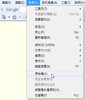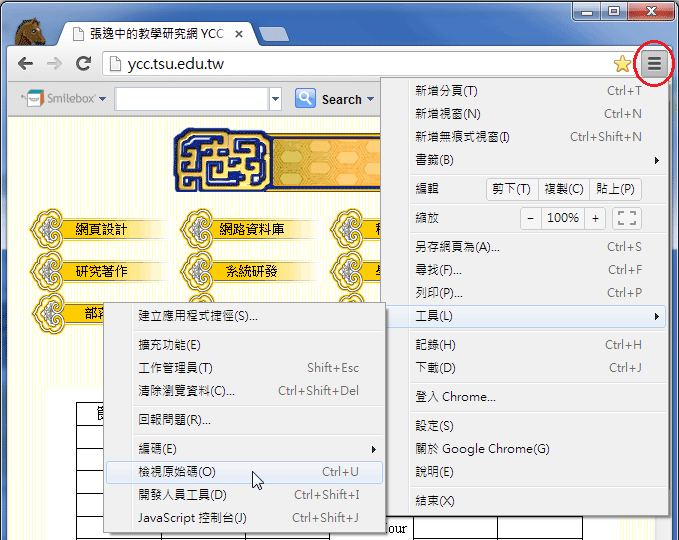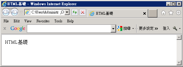 HTML文件的基本架構: 基本的網頁文件架構內容如下: ![]() 整個HTML文件除了內容的文字之外都是由標籤所組成,每個標籤由小於(<)及大於(>)符號當作括號使用。標籤本身的作用也如同括號,譬如整個文件的起始標籤是<html>,結束標籤就是</html>,在HTML中英文字的大小寫是通用的! 在HTML標籤內部的<head>標籤表示檔頭資訊區,有關整個檔案共用的資訊匯集中放自這個區塊,以上例來說裡面就有個 title 標籤,定義網頁標題(HTML網頁基礎);接著是網頁內容的標籤 body,裡面也寫著:HTML網頁基礎。 請開啟一個記事本程式如上寫作,並另存新檔成為附檔名為 htm 或 html 的檔案,譬如 a.htm 或 a.html 意義都相同。 接著用瀏覽器開啟應該會看到類似這樣的畫面: ![]() 此時可以試著開啟功能表中的檢視→原始碼功能(英文是View->Source)可以看到你寫的「程式」會忠實的顯示! ![]() 在 IE9瀏覽器中如果看到如上的功能表,請到瀏覽器標題空白處按右鍵,出現選單後選擇顯示功能表如下圖: ![]() 如果是使用Google Chrome瀏覽器,檢視原始碼的方式是從點選右上方的圖示(紅圈)開始,再找到工具選項的子項目→檢視原始碼: ![]() |